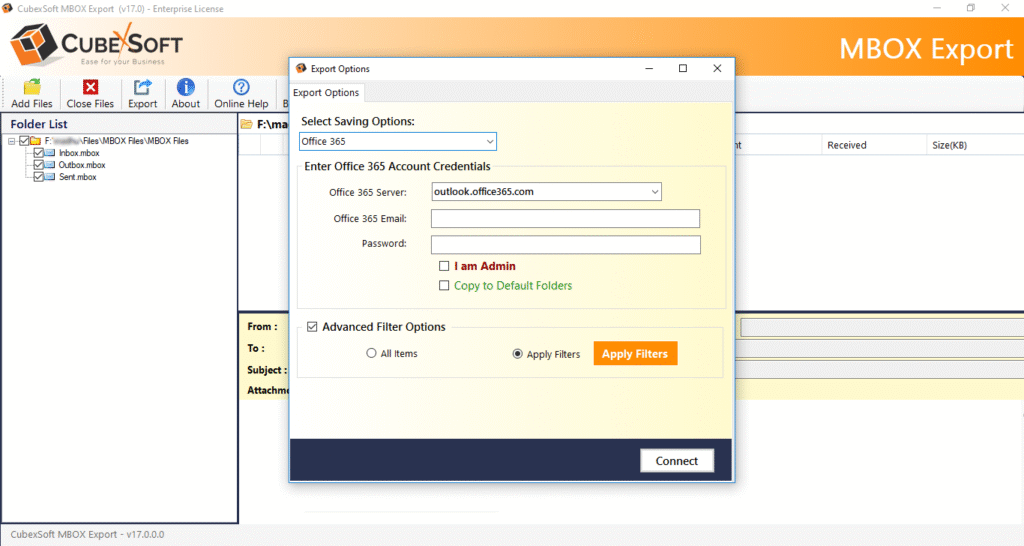 Direct Outlook 365 Integration – You can log in directly to your Outlook 365 account within the tool and upload MBOX files to any folder. No need to export PST or use additional applications.